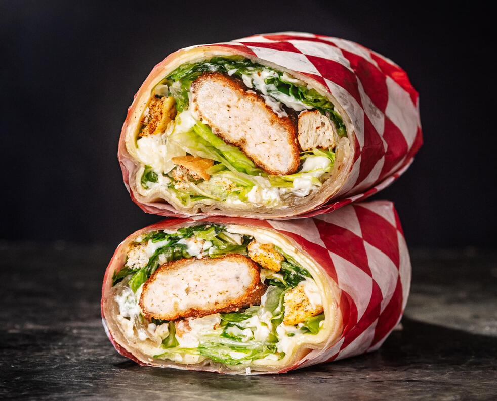 Tortilla de trigo, lechuga, rúcula, queso tybo, queso sardo, crutones, nuggets de pollo y salsa Porfiado. Incluye papas caseras y un dip de salsa alioli.Opcion Veggie: Girgolas