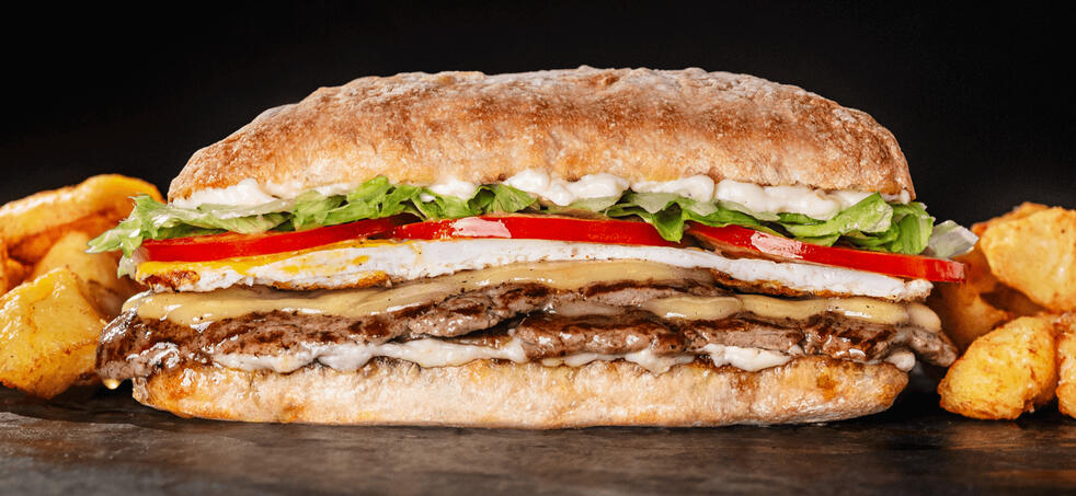 Pan horneado en el día, 150 gramos de LOM, queso tybo, huevo, lechuga, tomate y salsa Porfiado. Incluye papas caseras y un dip de salsa Porfiado.