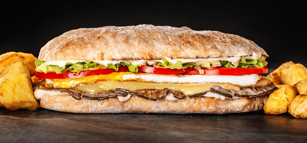 Pan horneado en el día, 150 gramos de gírgolas, queso tybo, huevo, lechuga, tomate y salsa Porfiado. Incluye papas caseras y un dip de salsa Porfiado.