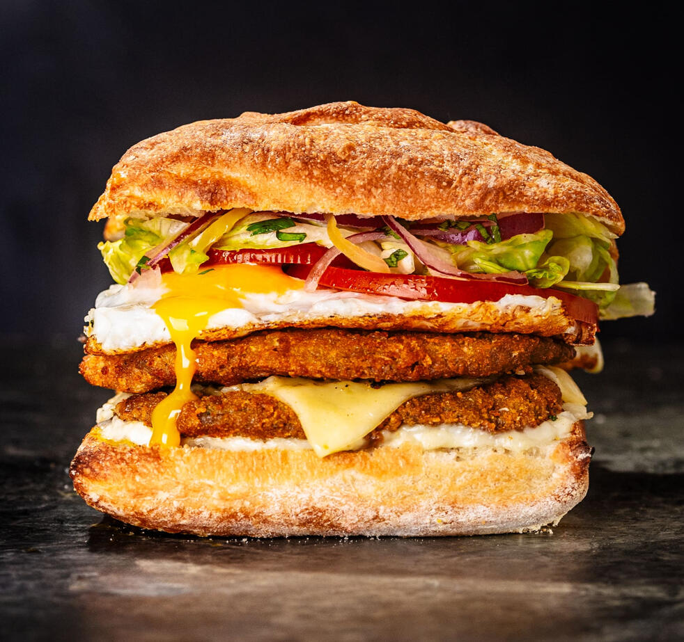 Pan horneado en el día, salsa Porfiado, un toque de mostaza, milanesa de peceto, queso tybo, huevo al molde, lechuga, tomate y sarsa criolla (cebolla morada, ajies en conserva y cilantro). Incluye papas fritas caseras y dip de salsa Porfiado.