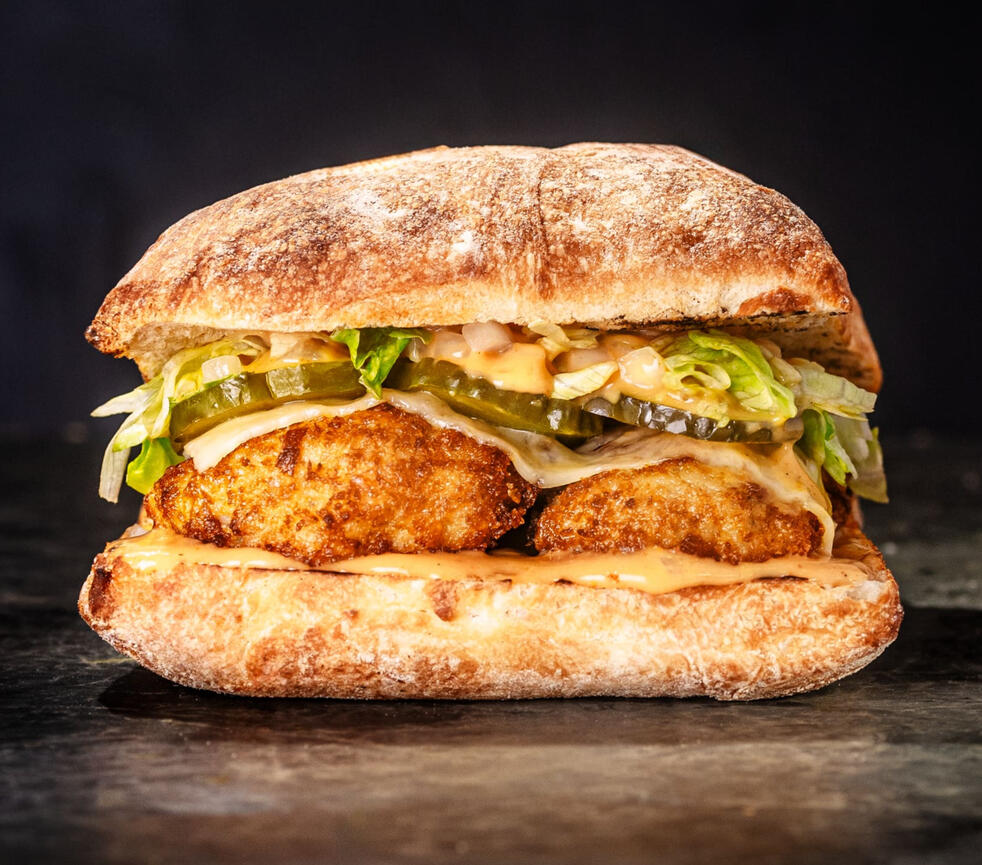 Pan horneado en el día, nuggets de pollo crispy, queso tybo, cebolla blanca, lechuga, pepinillos y salsa mil islas. Incluye papas caseras y un dip de salsa Porfiado.