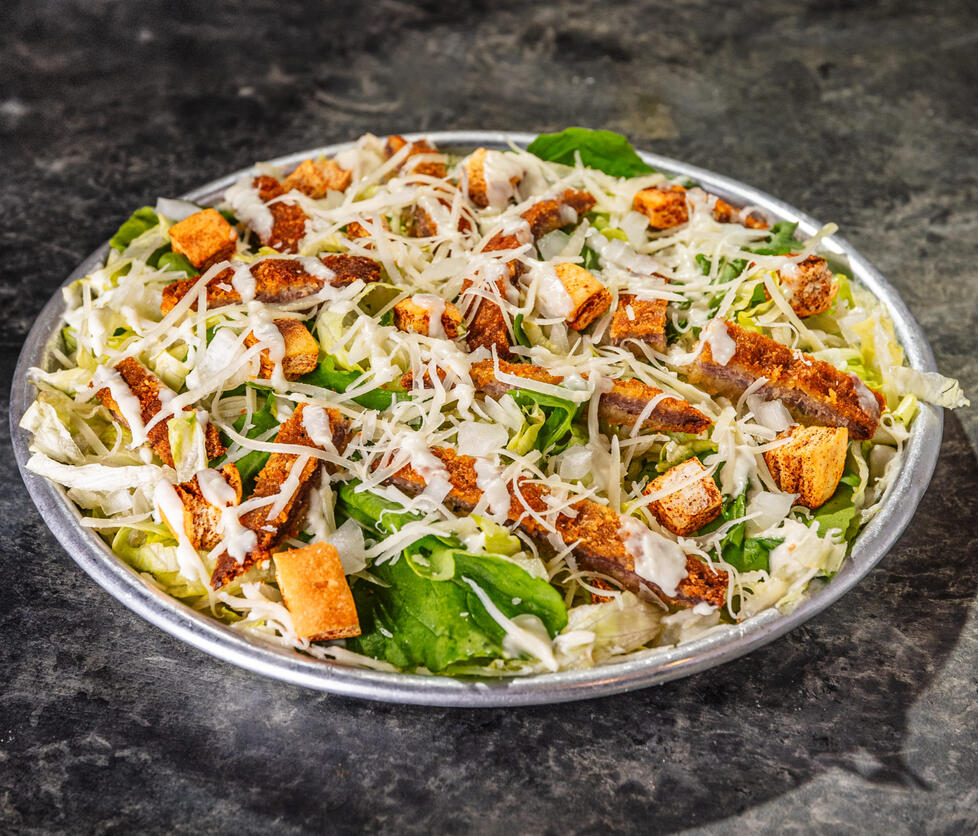 Lechuga, rúcula, cebolla blanca en brunoise, queso sardo rallado, crutones, milanesa de peceto cortada en tiras y un dip de salsa Pordiado.